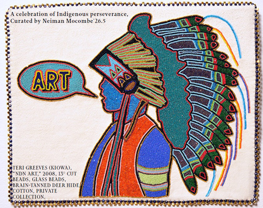 Neiman Mocombe (’26.5) has curated a collection of biographies, coffee-table books, and personal essays that illuminate the stories of contemporary indigenous people. With this collection, Neiman intends to address that “too often, Native Americans are portrayed as static, undeveloped, and frozen in time. This exhibition shares how Indigenous communities have persevered with strength and resilience, maintaining their sovereignty despite immense historical and ongoing adversity. Their courage is evident in the works selected here.”